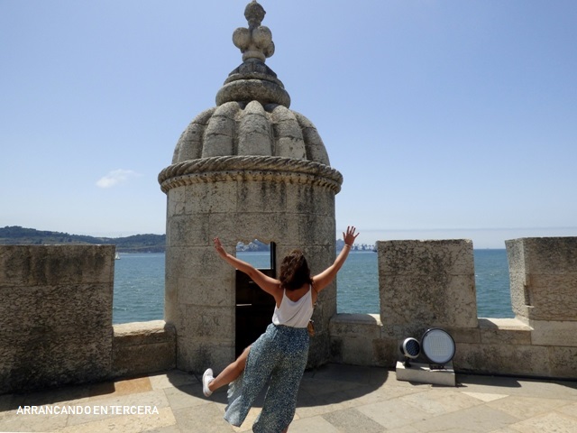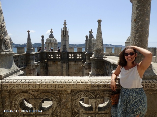 Tras 15 minutos llegamos a la TORRE DE BELÉM, probablemente el icono más conocido de Lisboa y sin duda uno de los más importantes de Portugal. Otra construcción manuelina del siglo XVI. Nos toca comernos unos 30-40 minutos de cola porque es domingo de julio y todo el mundo ha pensado que era buena idea venir aquí hoy. Cada turno entran 120 personas: primero pasan los que tienen la Lisboa Card –que siempre entran primero aunque hayan llegado más tarde– y luego rellenan con el resto de los mortales.