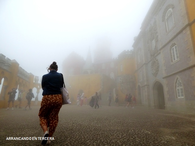 Nos quedamos un rato arriba con la esperanza de que la niebla se disipe. Durante un momento parece que… «¡Eh, ahí se ve algo entre toda esa masa blanca! Ah, no, es otra nube…». Total, que almorzamos unos bocatas de queso que nos habíamos preparado y que se convierten en el momento de mayor felicidad de la mañana. Regresamos al Palacio da Pena, con la inocente esperanza de que haya menos cola para entrar.