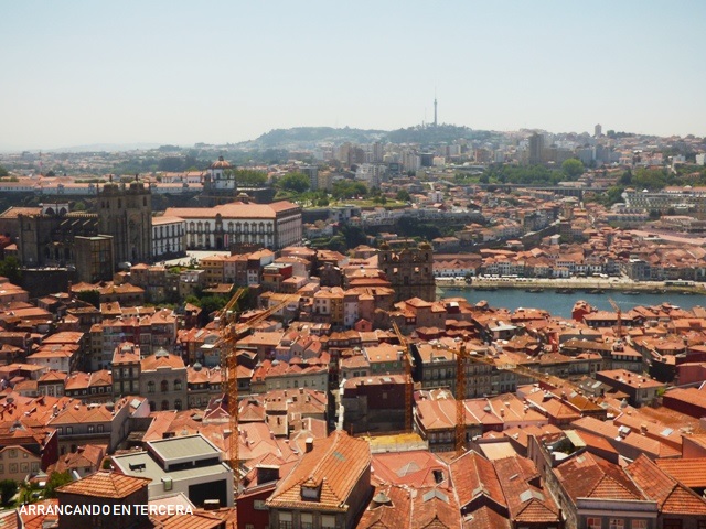 Para variar, cuando llegamos se nos informa de que hay 45 minutos de cola, que por suerte acaban siendo unos 20 minutos. Hay regulación de la gente que sube y baja debido a la estrecha escalera en espiral desde la que se accede a la torre. Una vez arriba, hay un pasillo circular que concede una panorámica de 360º de Porto; vistas preciosas, pero espacio masificado.