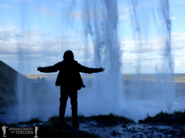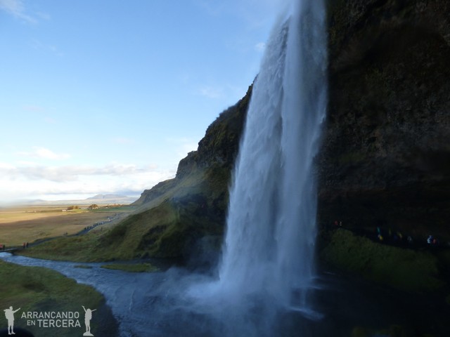 Bueno, pues Seljalandsfoss es una de esas cascadas descomunales que te dejan anonadado cuando te acercas. Con una caída de 60 metros, nos deja boquiabiertos a todos los que no estamos acostumbrados a sentir tan cerca la fuerza del agua. Se ha dispuesto una pequeña senda que permite recorrer la cascada por detrás. Nosotros llevamos pantalones y abrigo impermeables, pero utilizamos además una cubierta impermeable de pantalones y casaca impermeable tipo bolsa de basura pillada en Decathlon el amigo fiel.