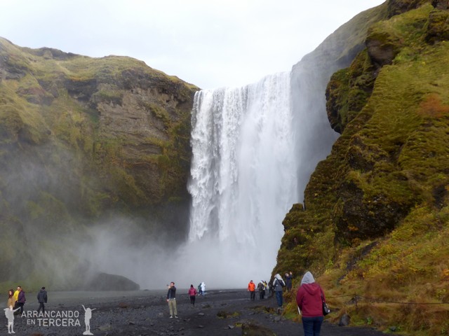El día va de cascadas: de foss a foss y nuestra siguiente parada es SKÓGAFOSS, acompañada del río Skógá y cuyo nombre significa «cascada del bosque». La cascada mide unos nada desdeñables 60 metros de alto y 30 de ancho; enorme la mires por donde la mires. Al parecer estos acantilados antiguamente daban al mar, pero este se fue retirando con el paso del tiempo.