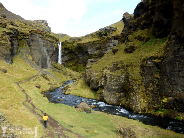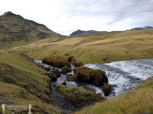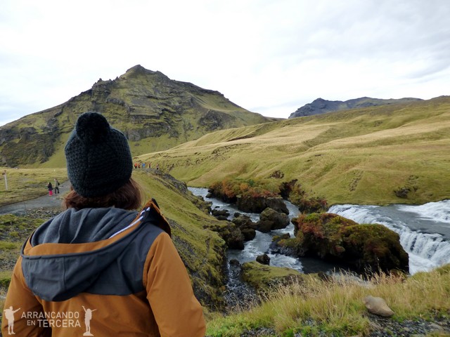 A la derecha de la cascada hay unas escaleras que permiten subir a un mirador desde el que observar su nacimiento. Una vez arriba, hay una ruta de unos 2,6 kilómetros (hacia Thórsmörk) que permite bordear el río Skógá. La senda incluye una decena de saltos de agua y es una preciosidad 360º. No tiene ninguna dificultad; de hecho lo más exigente del recorrido son las escaleras del principio. Paseamos con la calma embelesados con la belleza del lugar.