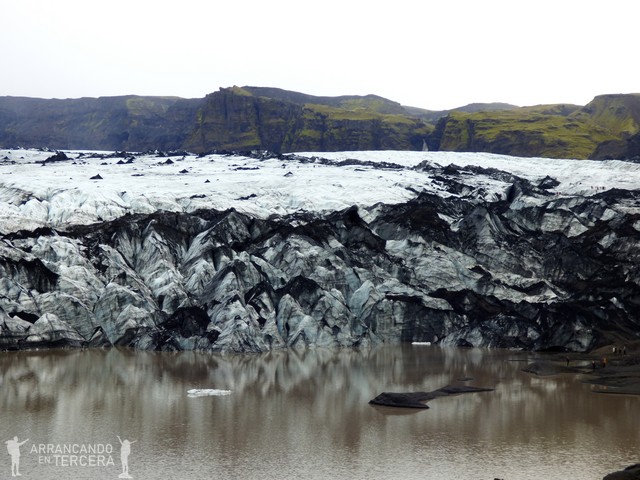 Y así es como llegamos a la lengua glaciar SÓLHEIMAJÖKULL («-jökull» significa glaciar), que proviene del glaciar Mýrdalsjökull, situado encima del volcán activo KATLA. La ceniza volcánica de Katla es la que confiere ese tono negruzco. Desde esta zona parten excursiones guiadas por el glaciar y de noviembre a marzo también a cuevas de hielo, formadas por el agua que transcurre debajo del glaciar. Nosotros nos limitamos a disfrutar del paisaje, algo menos concurrido que otros; pues ya tenemos reservada una excursión glaciar en Vatnajökull.