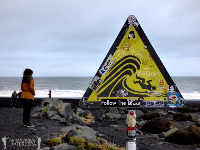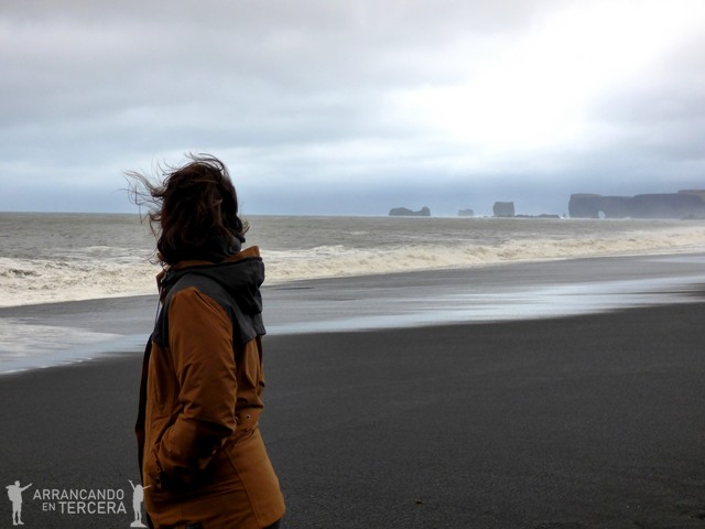 Ir desde Vík hacia las playas de arena volcánica nos obliga a conducir un valle elevado donde nos ataca con furia un viento huracanado. Nunca había agarrado con tanta fuerza el volante para no acabar en el carril de sentido contrario; los vientos islandeses de más de 80 kilómetros/hora son famosos pero nosotros no los habíamos experimentado antes. Perfectamente pueden arrancar la puerta del coche y no son el clima ideal para conducir. Por suerte la playa está cerca y aunque allí también hace un viento interesante, no es tan potente como en el valle.