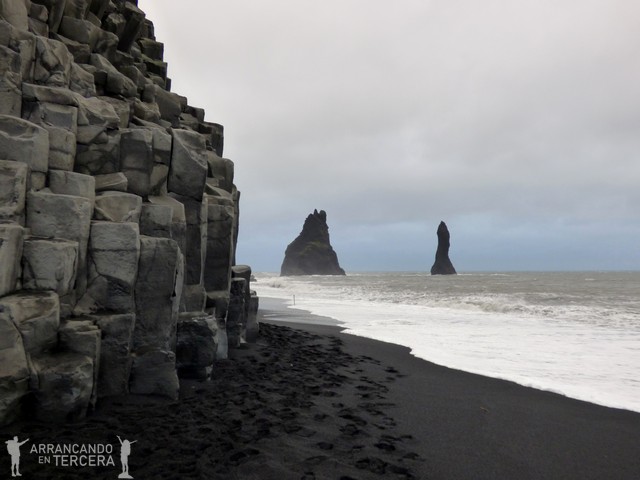 Desde la playa también se pueden observar los monolitos REYNISDRANGAR. Por más que he buscado el significado de «Reynis», que da nombre a todo por esta zona, no lo he encontrado. Las leyendas islandesas dicen que los monolitos son tres trolls (llamados Skessudrangar, Landdrangar y Langhamrar) que trataron de arrastrar un barco por la noche, pero les costó más de lo esperado y al salir el sol se convirtieron en piedra.