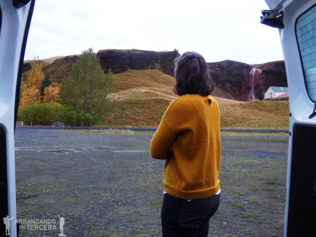 El ambiente es tan propicio que nos animamos y sacamos la mesa y las sillas para desayunar fuera. Este fue el único día que utilizamos el «pack merendero» porque el frío islandés derrotó a nuestros yos recién levantados. Tras los bocatas y Nescafés de rigor nos acercamos caminando a una cascada cercana pero discreta: STJÓRNARFOSS. ¡Descubrimiento inesperado! Si no nos hubiéramos desviado para acampar no la habríamos visto. Según Google Maps el descampado donde dormimos debe ser el parking de dicha cascada.
