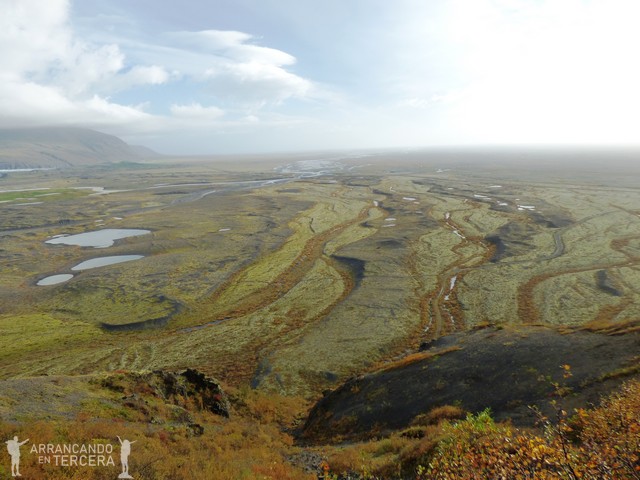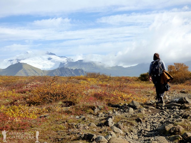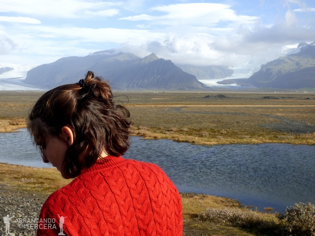 Nos dejamos seducir por este mirador y continuamos la circular hasta Skaftafell. Recomendamos llegar hasta aquí porque se puede disfrutar del lugar sin gente y al ser una circular el trekking no resulta nada monótono. Ciertas zonas me hacen pensar a ratos que caminamos sobre llanuras sudafricanas.