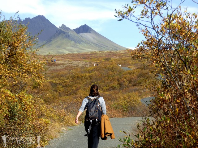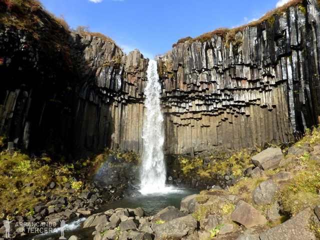 El septiembre islandés sigue tratándonos bien: hace fresquete pero el cielo está despejado. La caminata nos permite hasta quitarnos los abrigos. Nuestra primera parada es la famosa cascada Svartifoss, a unos 45 minutos del inicio. El camino hacia la misma está bien señalizado, incluye un par de miradores y es muy tranquilo.