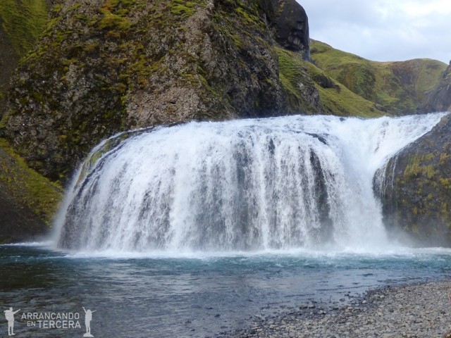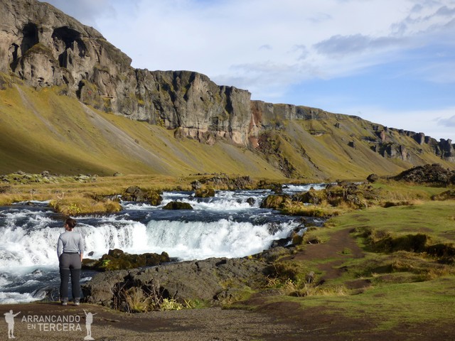 Stjórnarfoss significa «cascada del gobierno» y no es de las más impresionantes de Islandia (porque el nivel está muy alto) pero es muy bonita y disfrutarla en silencio no tiene precio. Allí nos encontramos con unos belgas y franceses que habían dormido en tiendas de campaña, ¡qué valor! También hay unas ovejas trepando verticalmente por paredes rocosas y balando sobre el valle reclamando su territorio. En la foto no se aprecia el precioso enclave montañoso porque era tan cerrado el valle que no cabe.