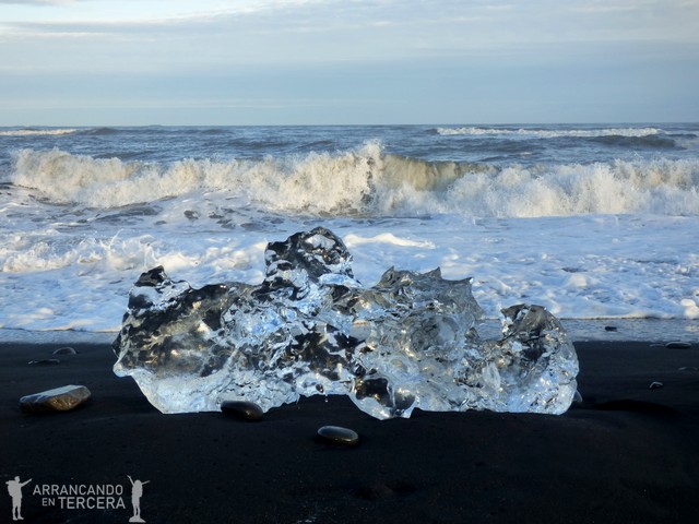 Después de absorber con los ojos el paisaje de postal, visitamos la PLAYA DE LOS DIAMANTES. Está al lado de la laguna, pero hay que coger el coche para cambiar de parking. La playa es famosa por sus arenas de color negro (origen volcánico, como siempre) y los pedazos de iceberg que trae el oleaje, provenientes del deshielo de la laguna y cuyos destellos sobre la arena oscura otorgan el nombre al lugar.