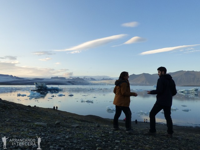 Al mal tiempo, buena cara. Tenemos la tarde libre para explorar la laguna y los alrededores. Aunque el viento amenaza con llevársenos volando, Islandia nos regala un atardecer espectacular.