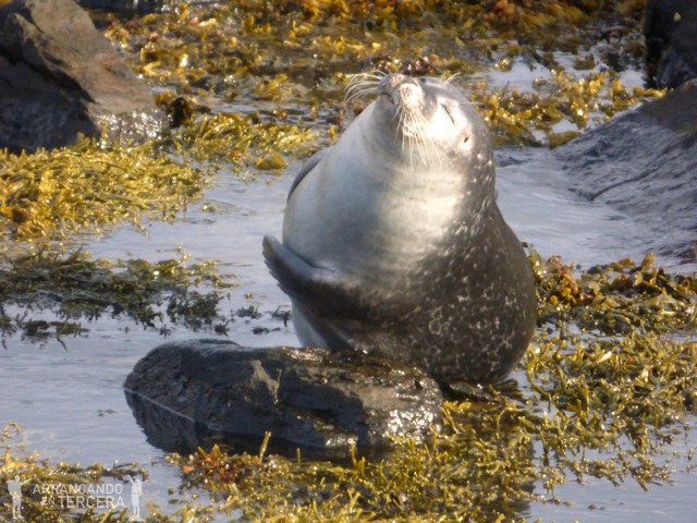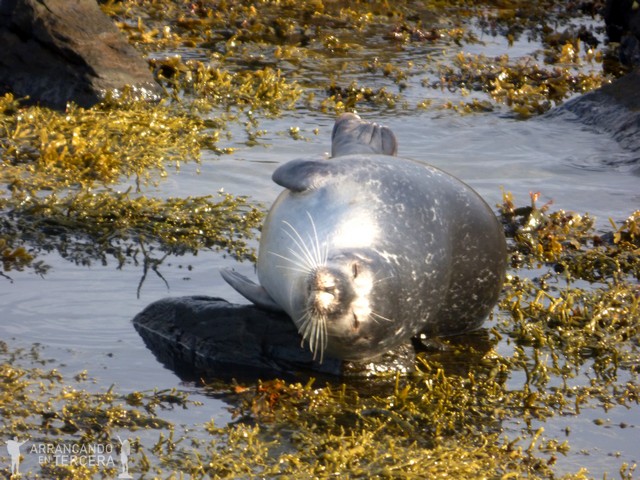 Este lugar incluye un agradable paseo junto al mar de unos 20 minutos, a no ser que os quedéis una hora viendo a las focas como nos pasa a nosotros. El paisaje es precioso, la calma impregna el lugar y se ven un montón de focas jugando y pescando, pero sobre todo descansando. Nosotros tenemos suerte y podemos verlas mucho más cerca que en la playa de Osar; además el propietario de la finca ha dispuesto una caseta con prismáticos. ¿Se puede ser más majo?