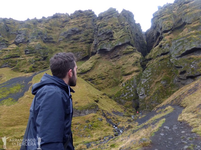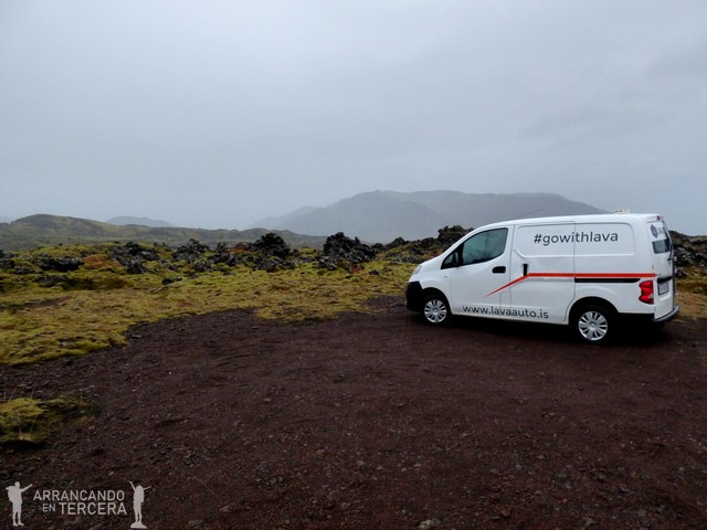 En este punto la lluvia es torrencial y el viento no se queda atrás. Somos varios los vehículos aparcados esperando a que se despeje el día. Algunos acaban por irse, otros nos resignamos a la lluvia y nos aventuramos a salir del vehículo con nuestras múltiples capas para enfrentarnos al clima islandés: camiseta y mallas térmicas, forro polar, pantalones térmicos con cubierta impermeable, guantes, abrigo cortavientos e impermeable con gorro.