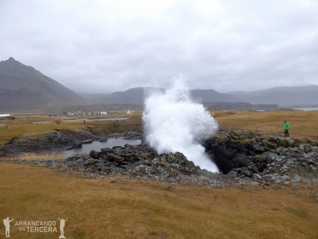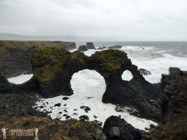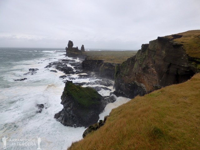 Nuestra siguiente parada obligada es LÓNDRANGAR, un mirador ubicado en el Parque nacional Snæfellsjökull. Lóndrangar son unas rocas basálticas de unos 70 metros de altura y con formas curiosas. El mirador está ubicado en una colina a la que nos cuesta subir por la fuerza del viento y la lluvia (no te preocupes, madre, hay vallas de seguridad). El oleaje rompiendo sobre estos acantilados conforma un paisaje digno de ver y cuando hace buen tiempo está repleto de frailecillos (en verano), gaviotas y otras aves marinas, que acostumbran a anidar en los riscos de los acantilados.