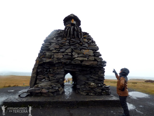 La lluvia parece amainar levemente así que disfrutamos del recorrido sobre los acantilados mientras llegamos a los principales puntos de interés: el famoso Arco Gatklettur y el monumento a Bárður, de madre humana y padre troll, que es protagonista de las sagas islandesas (hablaremos de ellas en la próxima y última entrada) y guardián de la región. El paseo no dura más de 20 minutos.
