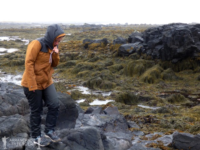 En Ytri Tunga hay un cartelito explicativo de las especies de focas que se pueden avistar. Vemos algunas de lejos pero guardamos mejor recuerdo de Vatnsnes porque en Ytri Tunga hay mucha niebla y un autobús lleno de turistas. Aunque intentamos alejarnos de la multitud, las rocas con musgo están resbaladizas así que no nos vamos muy lejos. La lluvia sigue siendo constante pero más fina y permite estar a la intemperie. Pasamos un rato agradable explorando las rocas de la playa, buscando caracolas y calmándonos con el rítmico sonido de las olas.