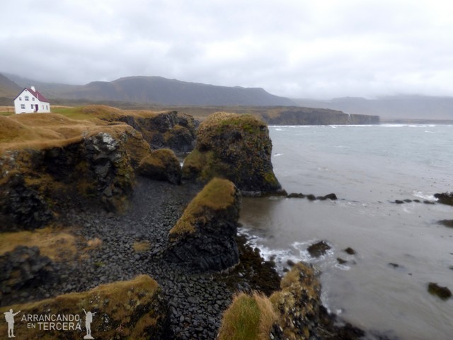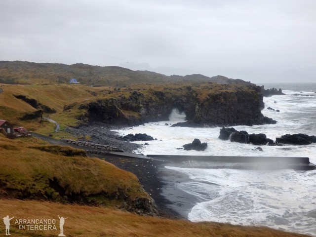 ARNARSTAPI es un pueblo pesquero, bonito y calmado, que tiene mucho que ofrecer en muy poco espacio. Nosotros recomendamos aparcar cerca del puerto, porque nuestro GPS se volvió loco y nos metió en fincas privadas. Desde el puerto hay bonitas vistas del mar y muchísimas aves graznando entre la lluvia. Si te colocas mirando al mar, hacia la derecha sale un sendero que conduce a todo lo que hay que ver.