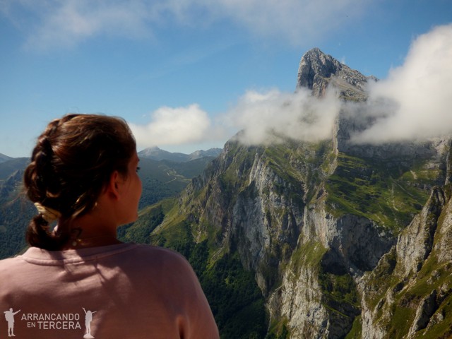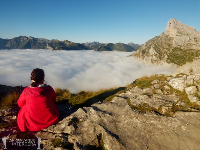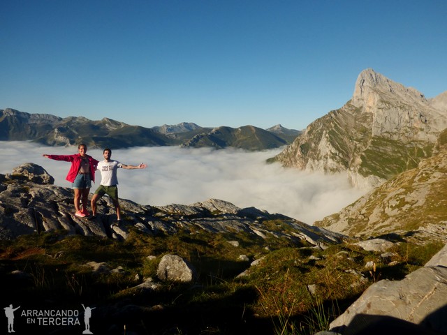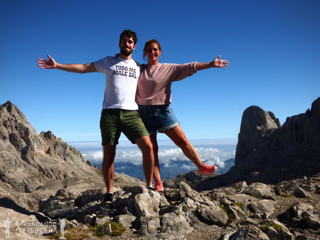 El COLLADO DE HORCADOS ROJOS se sitúa a 2343 metros de altura y ofrece unas imponentes vistas del Macizo Central de los los Picos de Europa, justo en la frontera con Asturias. A la derecha en la foto se alza el Pico Urriellu (2519 m) o Naranjo de Bulnes, probablemente el pico más emblemático de la zona. Almorzamos unos plátanos y frutos secos inmersos en la panorámica.