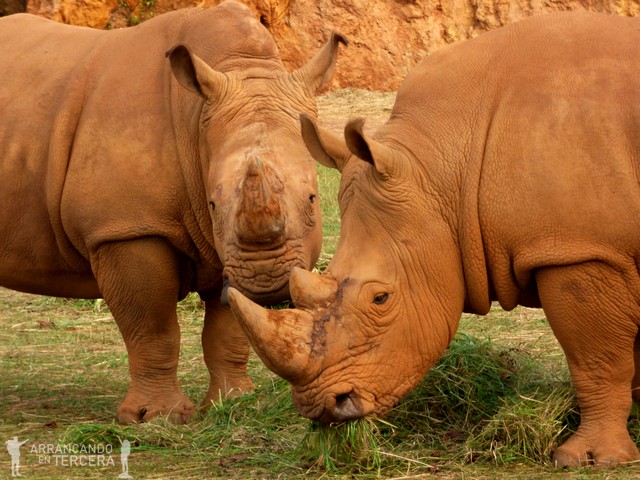 El rinoceronte blanco pesa hasta 2500 kilos y son perseguidos por sus cuernos, por lo que son una especie amenazada. Curiosamente su cuerno no es una prolongación del cráneo como los de las vacas; crecen de la nariz y están formados de queratina, como nuestro pelo y uñas.
