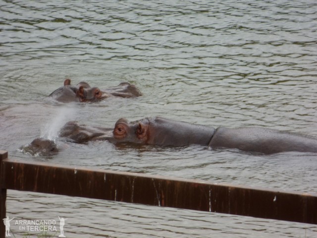 Después de comernos unos bocatas tirados entre los árboles de una zona habilitada, volvemos al recinto de los hipopótamos, que están entre los animales más difíciles de ver. Después de mucha paciencia asoman las cabezas unos segundos y se vuelven a sumergir.
