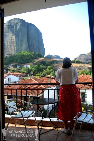 Nos despertamos a las 8 am. Aghhh, qué bien hemos dormido. Abrimos el ventanal de par en par y ante nosotros se aparecen las majestuosas masas rocosas de Meteora dándonos los buenos días mientras las golondrinas vuelan zumbando sobre los tejaditos de Kastraki. No se me ocurre un despertar mejor.