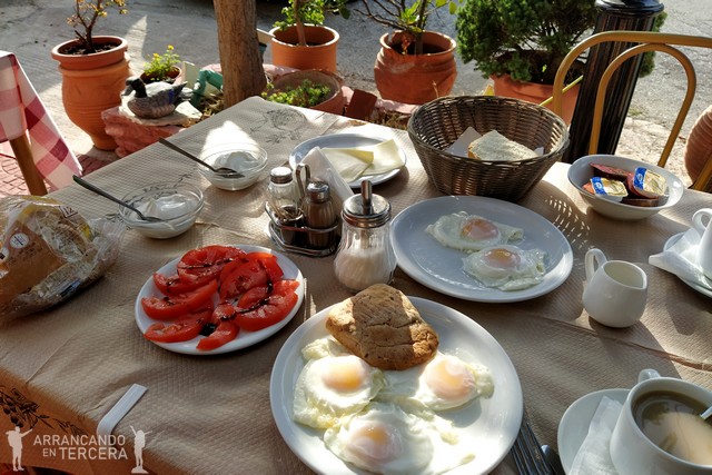 Bajamos y la mujer del apartamento nos despliega un desayuno bastante potente en la terraza exterior: huevos fritos, café, mantequilla y mermelada, yogur griego con miel, lonchas de queso… A la no-celíaca le pone además rodajas de pan y una ensaimada, y al celíaco le apaña rodajas de tomate aliñado y un huevo frito extra. Yo, como siempre, saco mi pan Schar. El café está malucho pero el desayuno bien vale los 7,5€/persona que cuesta.