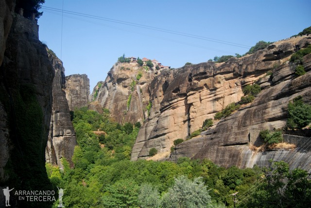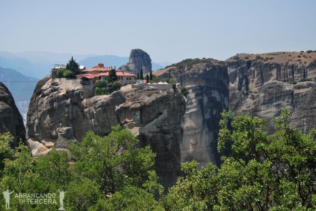 Continuamos por la carretera hasta acceder al MONASTERIO AGIA TRIADA (o Santa Trinidad). Su ubicación es sobrecogedora, ya que está enclavado en lo alto de un peñasco separado del resto de la montaña. De hecho, se dice que tardaron 70 años en llevar los materiales a lo alto de la roca y otros 18 para la construcción.