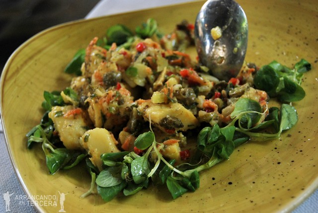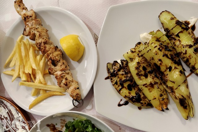 Pues ahí que nos sentamos. Una ensalada de la casa, los ya míticos peppers con feta, souvlaki de pollo y queso grilled. Todo muy rico por 32’80€. Apunte mental: Tenemos que hacer peppers con feta todas las semanas.