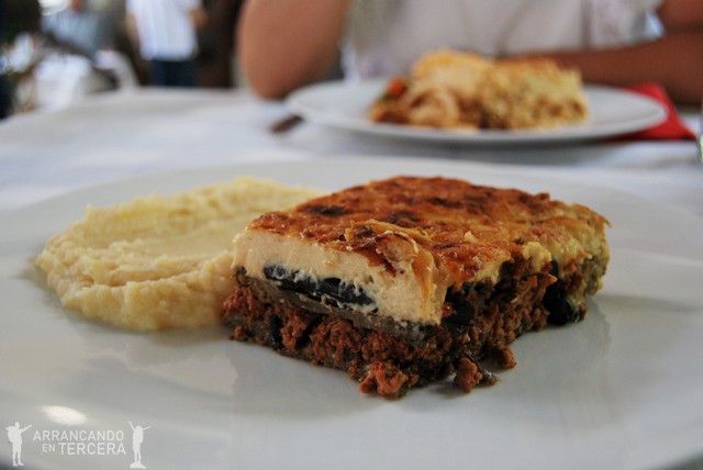 Comemos en Meteora Restaurant: Muy rico, barato y opciones sin gluten. Nos pedimos una ensalada de patata, feta grilled y moussaka sin gluten. Nos invitan a sandía de postre. Todo espectacular. Por poner un pero que no tiene nada que ver, tenían aves enjauladas que es algo que detesto.