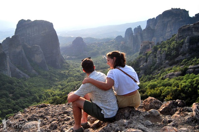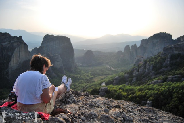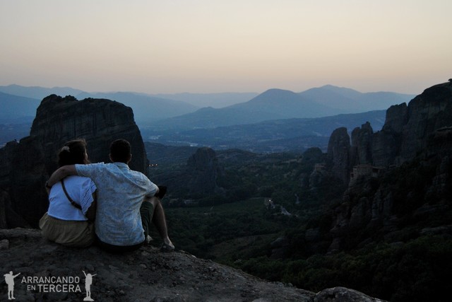 Va cayendo la tarde y no nos cansamos de contemplar extasiados el baile de luces entre los macizos montañosos que nos regala este lugar. El Valle de Meteora desprende una atmósfera mística y solemne; es difícil no sentirse diminuto. Nosotros nos dejamos atrapar por su belleza, su calma y su grandeza hasta que ya es imposible exprimir más el atardecer.