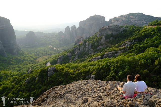 Las fotos que pongo a continuación son de uno de los dos MIRADORES más famosos para ver atardecer sobre Meteora. Esto supone que las vistas son una maravilla, pero también que están un poco masificados en verano. Este es el más cercano a Roussanou; a nosotros personalmente nos gustó más el otro, algo más alejado si partimos desde Kastraki.
