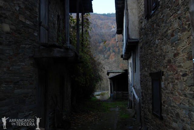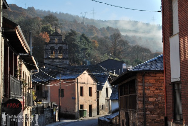 Sobre los 9 kilómetros llegamos a TRABADELO, y menos mal porque nuestros estómagos se quejan casi tanto como el hígado de los villafranquinos fiesteros. El enclave del pueblo en medio de los bosques otoñales no puede ser más bonito.