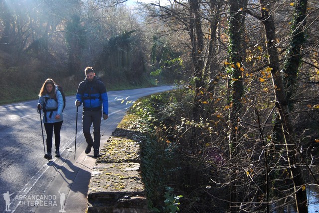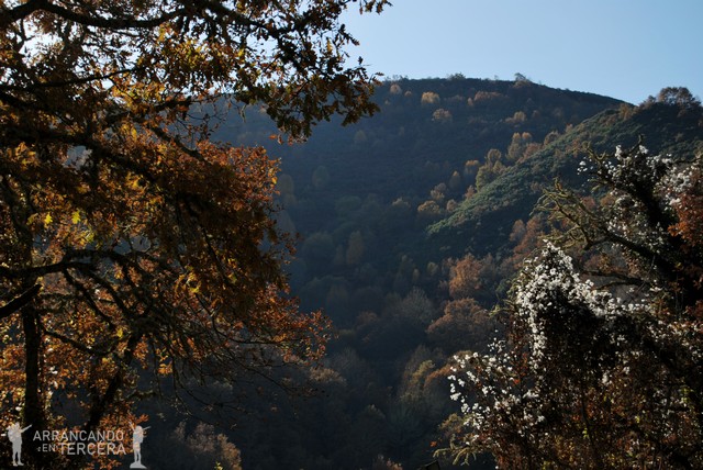 Atendiendo a los mojones indicativos comenzamos una subida constante, sin prisa pero sin pausa, zigzagueando entre la montaña. Dejamos atrás los pastizales de montaña, los cultivos de berzas y la compañía esporádica de caballos, gallinas, perros y gatos; para adentrarnos en bosques otoñales de castaños y robles.