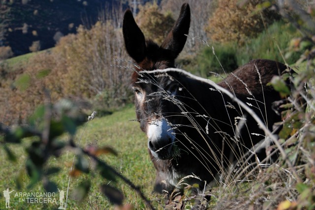 Dejamos atrás los bosques para adentrarnos en zona abierta de pastizales, donde reaparecen las vacas y un burro curioso y sociable que bautizamos como Problemas. Sin la sombra de los árboles y siendo las 3 de la tarde el sol nos castiga más que en todo el día; ya vamos en manga corta. Hay que decir que estamos agotados pero que las panorámicas de la etapa son espectaculares. La pendiente comienza a suavizar.