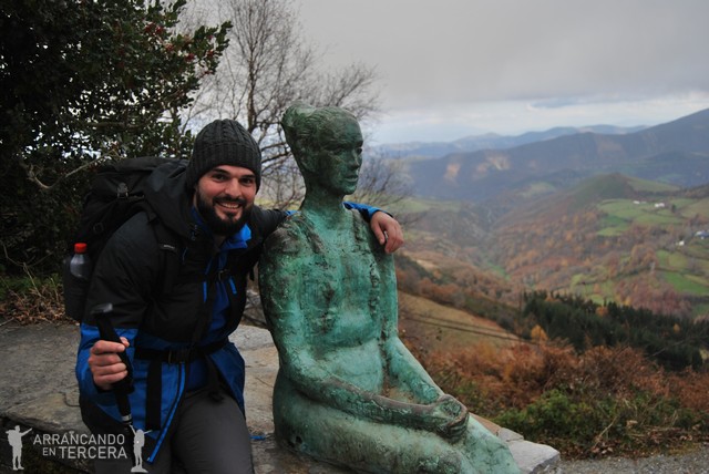 El cielo nublado y la brisa suave son clementes con nosotros y nos ayudan a completar el empujón final, en el que recorremos lo que nos queda con unas magníficas vistas al valle. Unos kilómetros antes de O Cebreiro nos encontramos con la estatua «Gaiteiro» en referencia a una leyenda medieval que habla de un peregrino alemán que se perdió en las montañas y pudo llegar guiado por el sonido de una gaita; y casi a la entrada del pueblo el Monumento a la Peregrina.