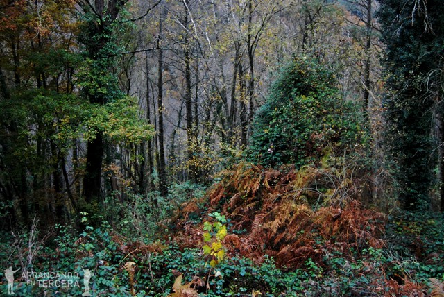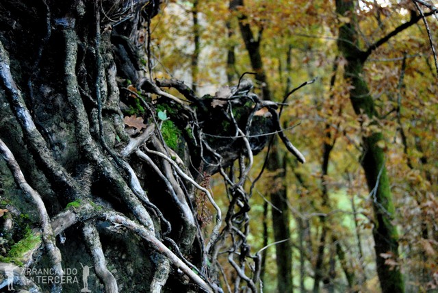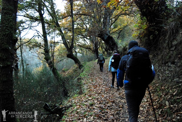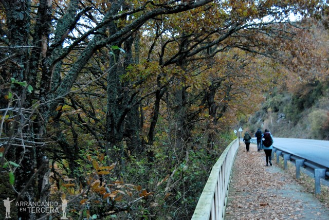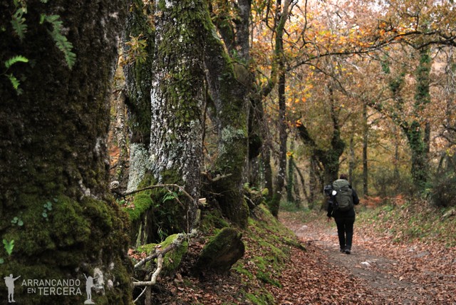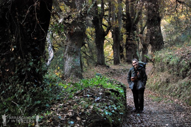 Nos vemos obligados a hacer alguna que otra parada de semi-despelote entre robles y castaños para masajear un poco las rodillas lesionadas. Parece mentira que seamos montañeros, menudos viejos estamos hechos. Muy a mi pesar, me resigno a dejar de trepar y correr de aquí para allá para hacer fotos.