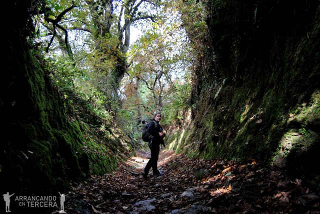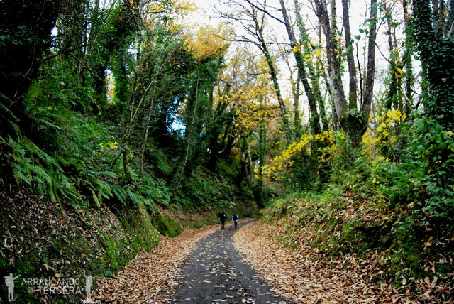 La ruta continúa por un puente que pasa por encima del río (ya no es el Oribio sino el Sarria) y, tras dejar a la izquierda un cementerio, nos conduce hacia un bosque de castañeiros que está en todo su esplendor otoñal, con el suelo repleto de una cobertura de hojas húmeda y tierna (perfecta para amortiguar nuestras rodillas) y un festín de castañas y avellanas para las ardillas.
