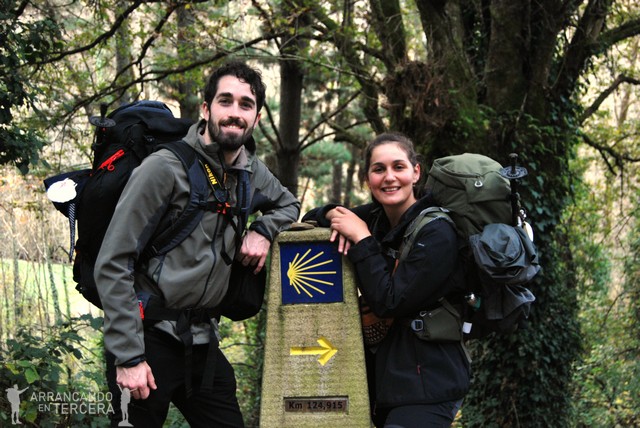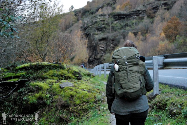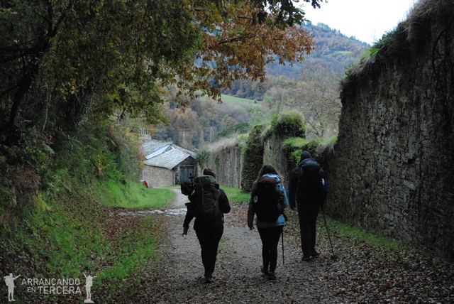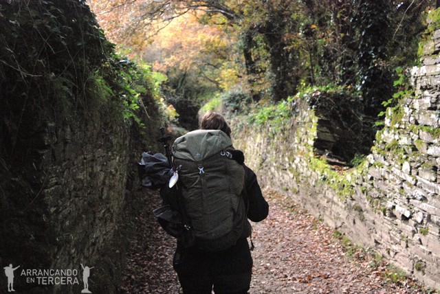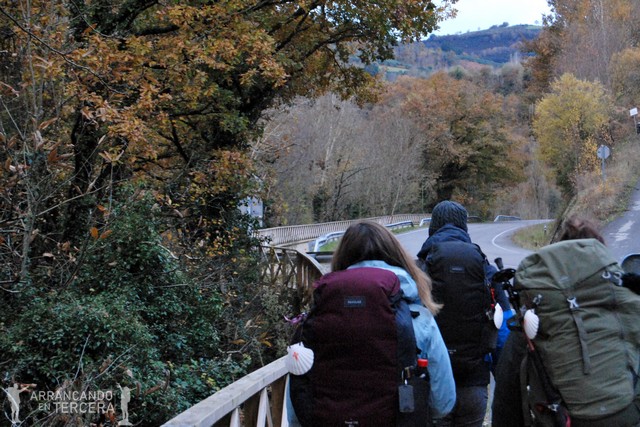 Hace fresquete pero no llueve ni nieva, así que no vamos con tantas capas como el día anterior. El Camino nos conduce bordeando la carretera junto al río Oribio, que posteriormente confluirá con el río Sarria. El tedio del asfalto queda eclipsado por las mil tonalidades de verdes, naranjas y amarillos que nos regalan los frondosos bosques de ribera.
