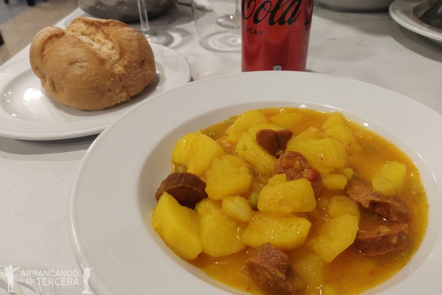 Con muchos menos kilos a las espaldas, entramos al primer restaurante que vemos abierto: el Restaurante O Descanso. Opción muy buena para celíacos. Nos pedimos un menú del peregrino contundente a base de patatas a la riojana (nos sacan un pozal enorme que nos cuesta finalizar, pero lo conseguimos) y un revuelto de salchichas con huevo.