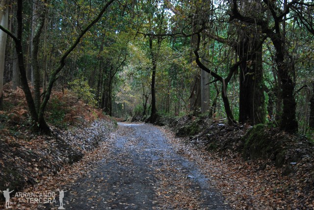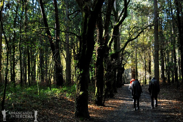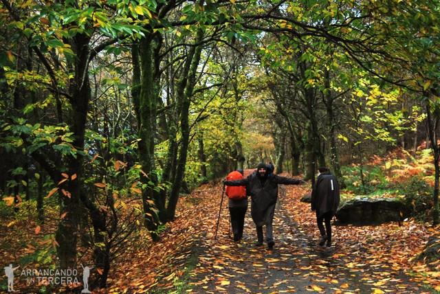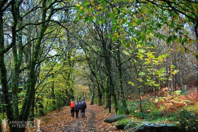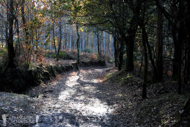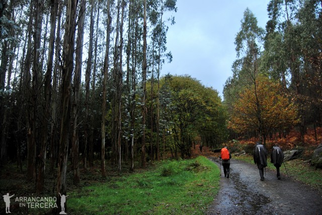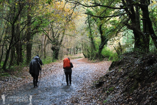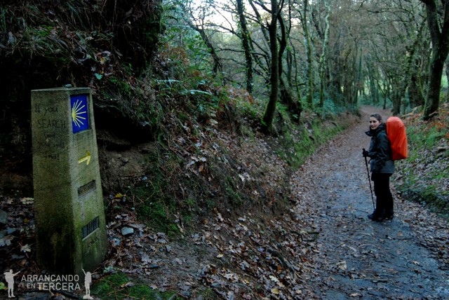 Atravesamos un bonito robledal que disfrutamos sin las inclemencias del clima; es cierto el dicho de «Después de la tormenta siempre llega la calma». Descendemos en pendiente suave y cerca de un mojón que indica 15 kilómetros hasta Santiago («¡¡SOLO 15 KILÓMETROS!!») hay una bifurcación. Tomamos la de la derecha, que parece algo más corta y creemos que es la del Camino oficial; aunque la aplicación del móvil «Buen Camino» nos manda por la otra.