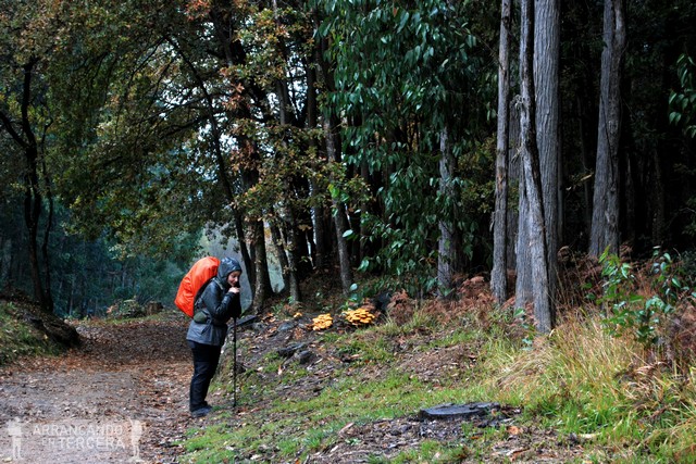 La previsión del día de hoy es mala, aunque de momento solo cae lluvia fina. No muy lejos de Arzúa nos adelanta el marsellés, que nos regala algún consejo sobre remedios caseros para las rodillas lesionadas (aunque en francés solo entendemos la mitad de lo que dice). Después se aleja cantando felizmente hasta perderse de vista por un bosque de robles (en gallego «carballos») acompañado por el trino de los petirrojos. Deja de llover; de nuevo el clima es mucho mejor de lo esperado (puntualizo: de momento).