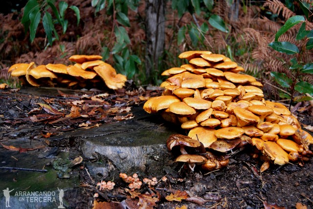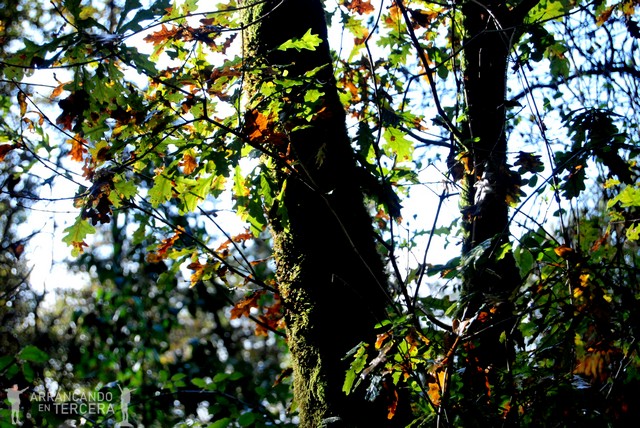Llueve de nuevo. Atravesamos espectaculares robledales otoñales donde una cobertura de hojarasca multicolor nos regala rincones preciosos.