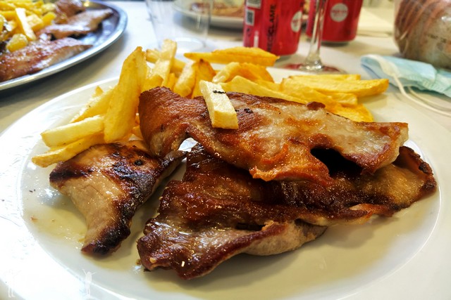 Acabamos en el Restaurante Regueiro, donde ofrecen Menú del Peregrino por 12€. Comemos bien: una ensaladilla rusa, secreto ibérico con patatas (súper abundante, me lo lo hacen en una parrillada aparte por contaminación cruzada) y postres varios.