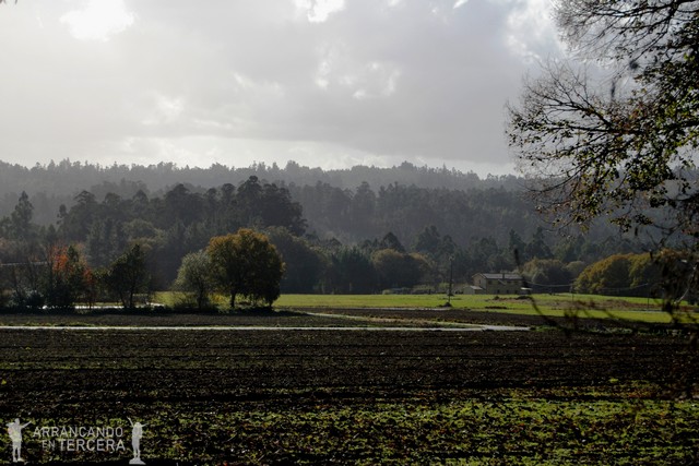 El Sol va ascendiendo en el horizonte y de vez en cuando se deja filtrar entre las nubes, permitiéndonos disfrutar las vistas de los prados de pasto, cultivos (llaman la atención los de berzas, como siempre) y pequeñas aldeas con hórreos: la esencia de la Galicia rural. En algunas casas pone «Fincas subvencionadas por mejora paisajística».