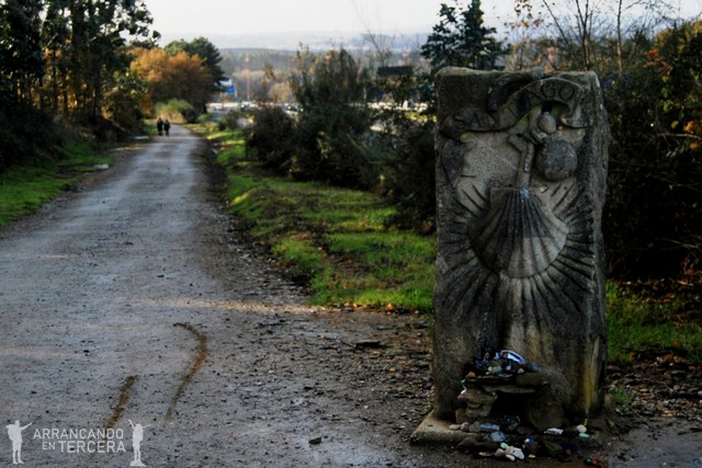 En el kilómetro 25’4 nos encontramos el MONOLITO DE LA CONCHA DEL PEREGRINO, con su vieira y su zurrón tallados, que nos da la bienvenida al municipio de Santiago. En su base hay muchas piedrecillas dejadas por los caminantes.