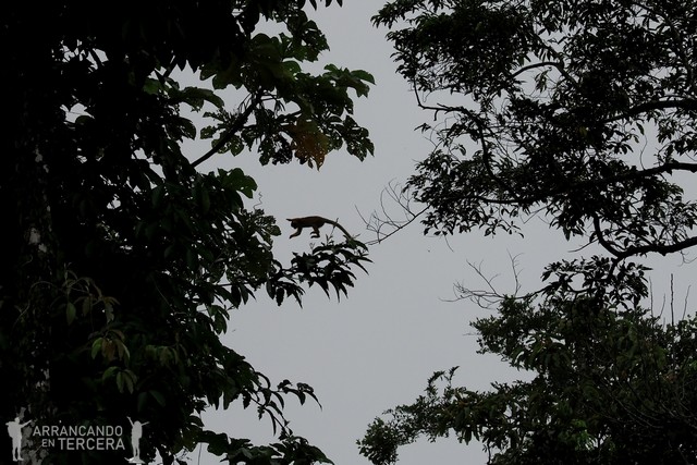 No llevaremos ni una hora en barca cuando el movimiento de unas ramas nos avisa del avistamiento más emocionante de la mañana: varios monos ardilla se desplazan entre los árboles saltando de rama en rama. Apenas se dejan ver diez segundos pero consigo hacer una foto justo cuando la silueta de uno se recorta entre los árboles.