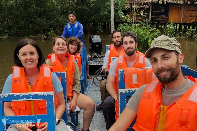 A las 7:15 de la mañana ya estamos saliendo en barca para la excursión de la mañana, que duraría nada menos que 4 horas y media. Edgar nos dice que nos llevemos bañador, toalla y crema de sol (imprescindible porque el sol amazónico te quema sin que te des cuenta) porque hoy nos vamos a bañar. «¿Cómo? ¿En el mismo agua donde se ocultan caimanes de seis metros?»