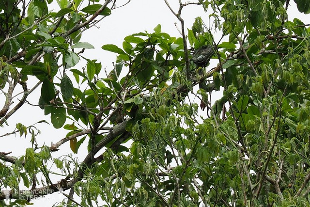 Después de un rato buscando, Edgar lo consigue. Madre mía, si la fauna del Amazonas se camufla bien, las iguanas ya ni te cuento. La foto está hecha con bastante zoom, pero ahí estaban… ¡Dos iguanas verdes!