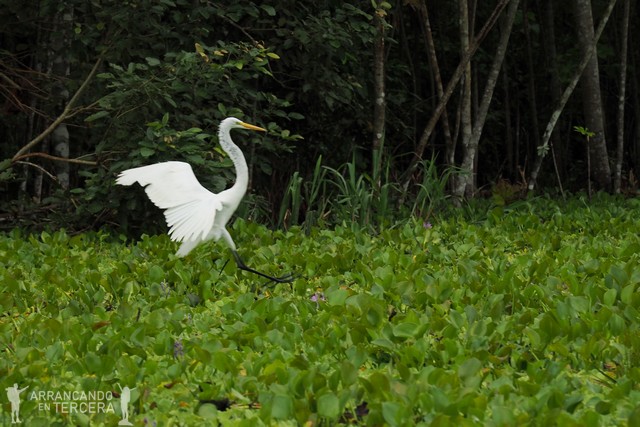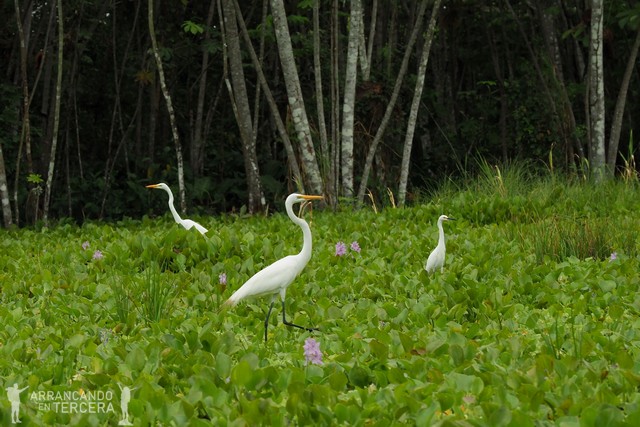 Las garzas suelen estar encima de «praderas flotantes» que se forman por la congregación de miles de pequeñas plantas acuáticas. Es curioso porque la barca motorizada avanza por el medio de estas plataformas, que se abren a nuestro paso dividiéndose en nuevas islas temporales. La barca a veces se atasca porque el motor se llena de vegetación, pero deben estar acostumbrados; le dan unos segundos marcha atrás y se limpia.