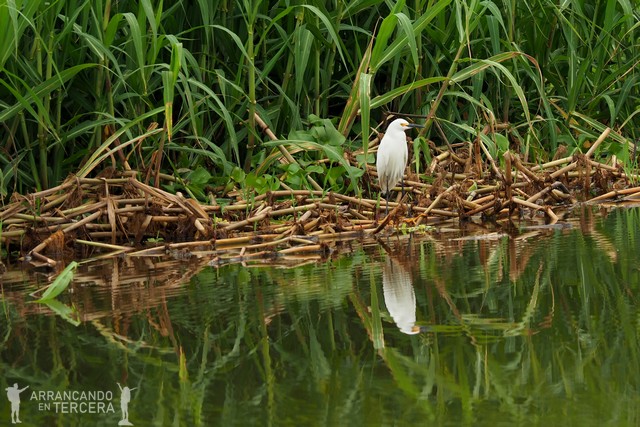 Otra más: la garceta nevada o «garza pequeña pico negro». Más pequeña que la garza blanca y con pico más corto, espera a las orillas de los ríos para alimentarse de gusanos, pequeños peces, ranas, caracoles, sapos…